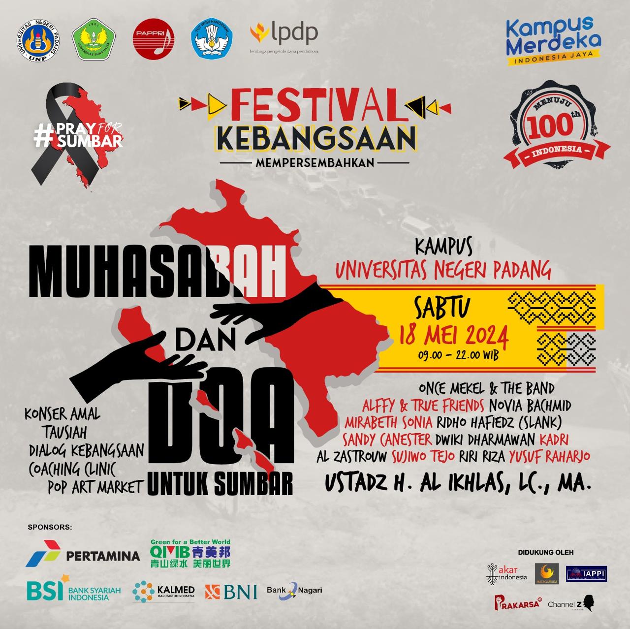 Acara Muhasabah dan Doa yang dikemas dalam format seni budaya ini akan dilaksanakan pada Sabtu 18 Mei 2024 di kampus UNP pada pukul 09.00 – 22.00 WIB. Beberapa artis yang akan hadir diantaranya Once Mekel, Dwiki Dharmawan, Ngatawi Al Zastrouw, Alffy Rev, Novia Bachmid, Sujiwo Tejo, Mirabeth Sonia, Ki Ageng Ganjur, Sandy Carnester, Ridho Slank dan Ustadz dari civitas akademika UNP.